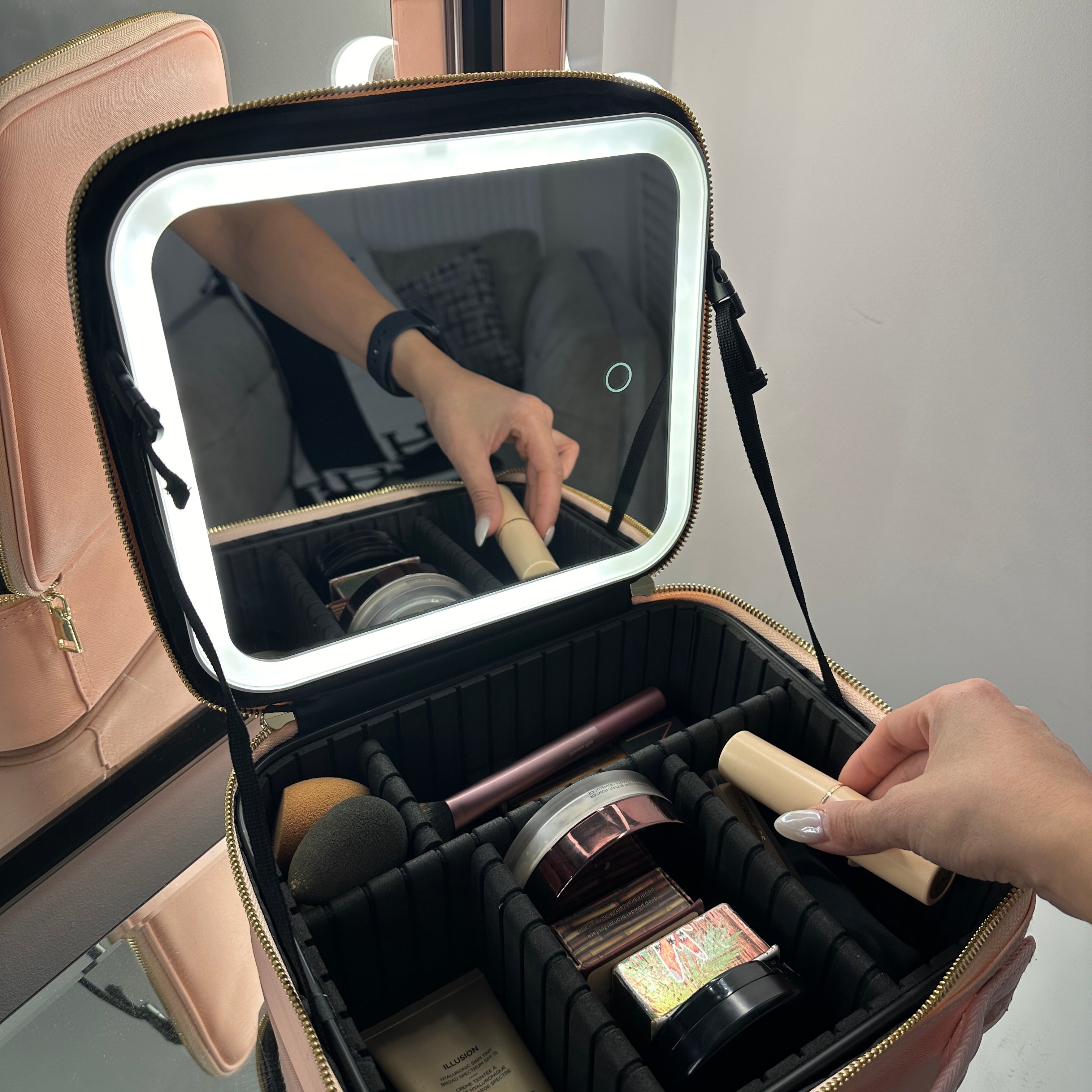 MyMirror Makeup Case is able to fit up to*: 48 lipsticks, 33 face powders, 6 foundations, 14 eyeshadow palettes, and 86 brushes.